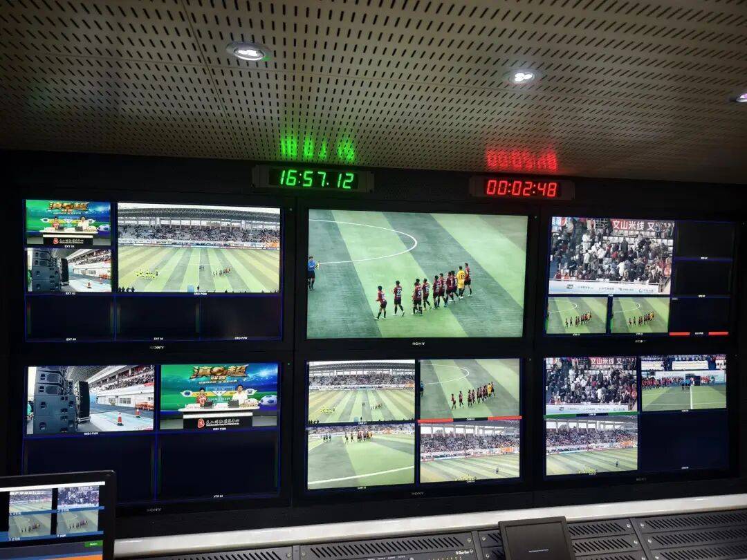 总导播刁红目光如炬,紧盯着由“6个固定机位+1个自由机位+1台无人机”组成的“视觉矩阵”,手指在切换台上快速精准操作。“1号机稳住全景,锁定攻防转换节奏!”“切4号机,给教练席特写!”“5号机跟拍带球,切航拍!”……他的指令清晰果断,随着球员的奔跑、传球、射门,实时调度不同视角。