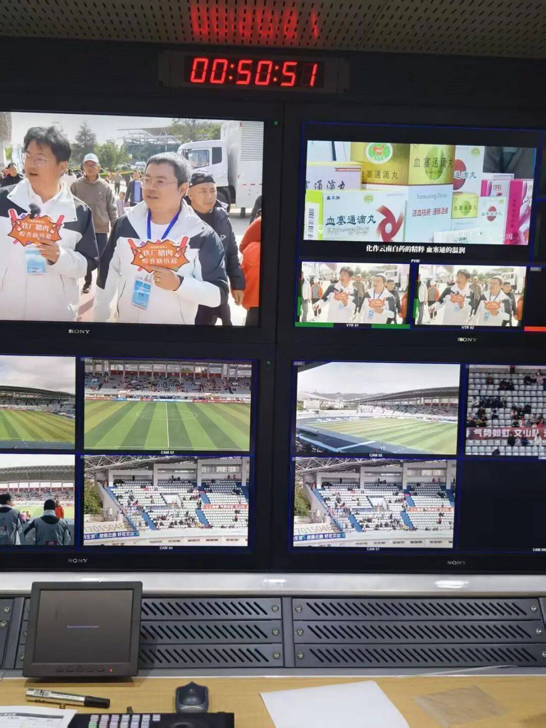 15∶00,当裁判吹响开赛哨声,文山市盘龙体育场瞬间沸腾,直播车内也同步进入“战时状态”,无论是导播、摄像还是字幕、后期、慢动作回放,每一个岗位都火力全开。