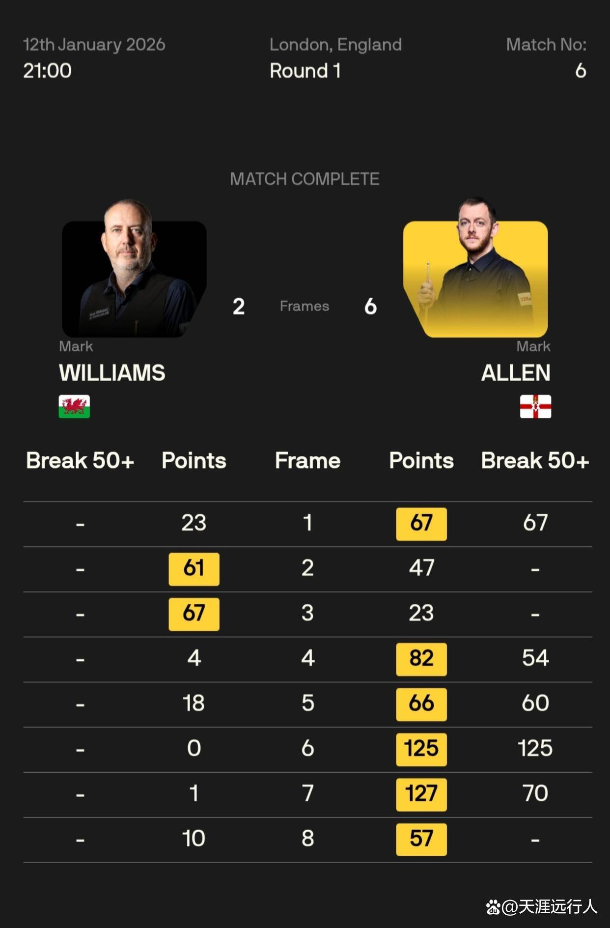 与此同时,在一场备受瞩目的“马克德比”中,排名赛12冠王马克·艾伦状态神勇,凭借一波酣畅淋漓的五连鞭,以6-2的比分击败了手握两圈大满贯、两届大师赛冠军、七个三大赛头衔的马克·威廉姆斯,强势晋级八强。