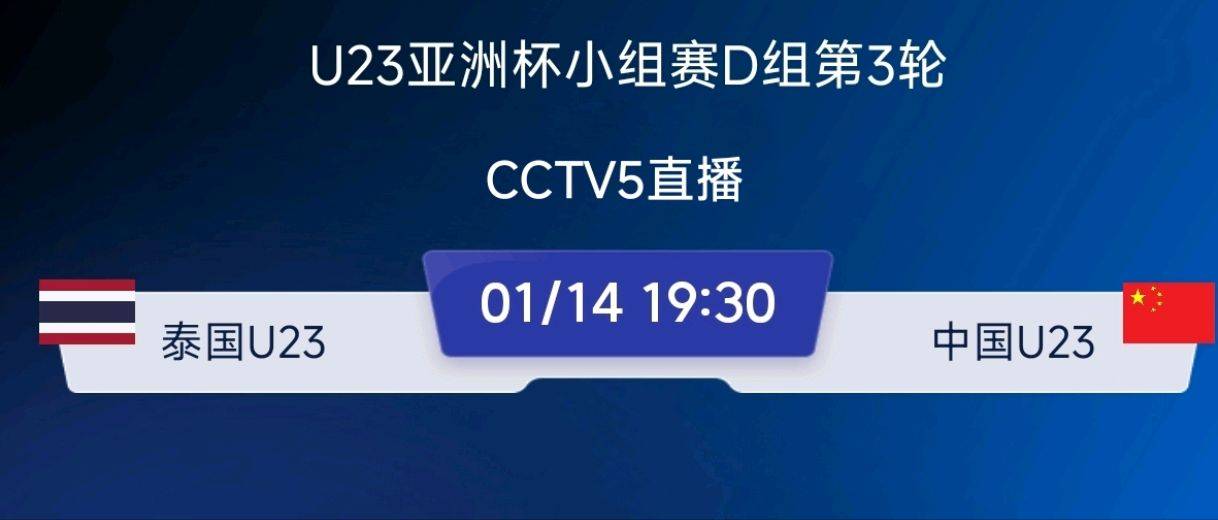 两战积4分并1球未失,U23国足两轮结束之后力压澳大利亚、伊拉克这些豪强,在D组领跑积分榜。接下来U23国足只需要一场平局即可稳获小组出线权。根据赛程安排,中国队将在北京时间1月14日晚19点半,迎来小组赛末轮对阵泰国队比赛。对于这场事关出线的小组赛收官之战,央视体育频道CCTV5也将在明晚同步直播本场焦点之战。