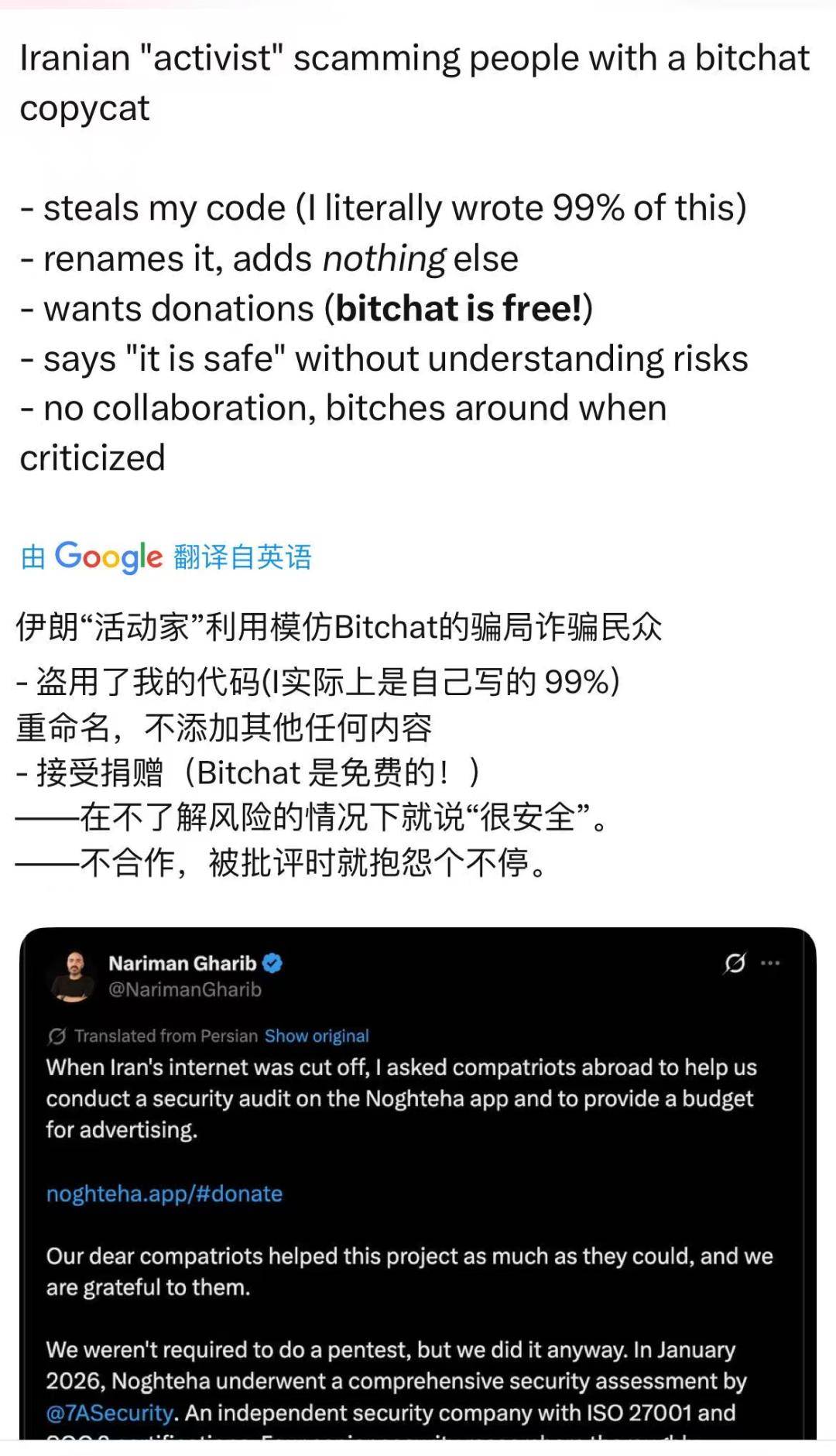 当然,bitchat并不代表百分之百的安全,X上一位用户就遇到了恶意诈骗行为。博主指出,这位名为Nariman Gharib的伊朗“活动家”,盗用了博主的代码,利用模仿bitchat的骗局诈骗民众,接受打赏捐赠。