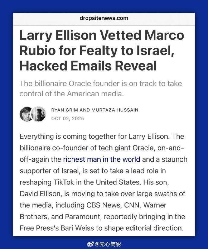 这封邮件的内容显示,甲骨文公司创始人拉里・埃里森早在 2015 年便核查过现任美国国务卿马尔科・鲁比奥对以色列的忠诚度,还为鲁比奥的竞选活动注资数百万美元;他曾向托尼・布莱尔研究所捐赠 3.5 亿美元,还承诺与特朗普携手助力 “新加沙” 重建,至今仍是以色列在美国的最大支持者之一。