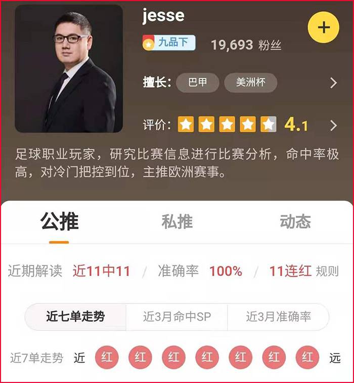 职业玩家【jesse】11连红,周期回报超6倍。以推荐命中欧洲杯决赛完美收官,连续7天推荐全部命中。jesse在欧洲杯期间推荐战绩非常稳定,近15天解读发26中21,半月命中率超80%。【定制jesse赢下更多连红】