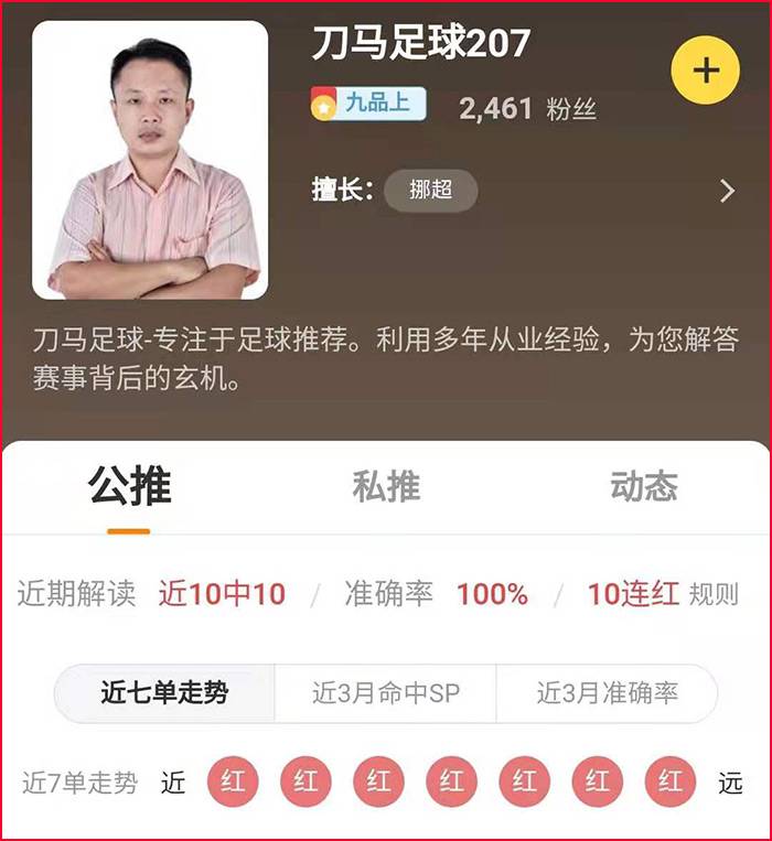 资深专家【刀马足球207】同样拿下10连红,回报超过11倍。期间推荐屡中高回报,包括命中了上周末日职广岛三箭主场0-1不敌垫底球队横滨FC的冷门。刀马足球207最近15天的战绩推20中15,半月推荐回报超7倍。