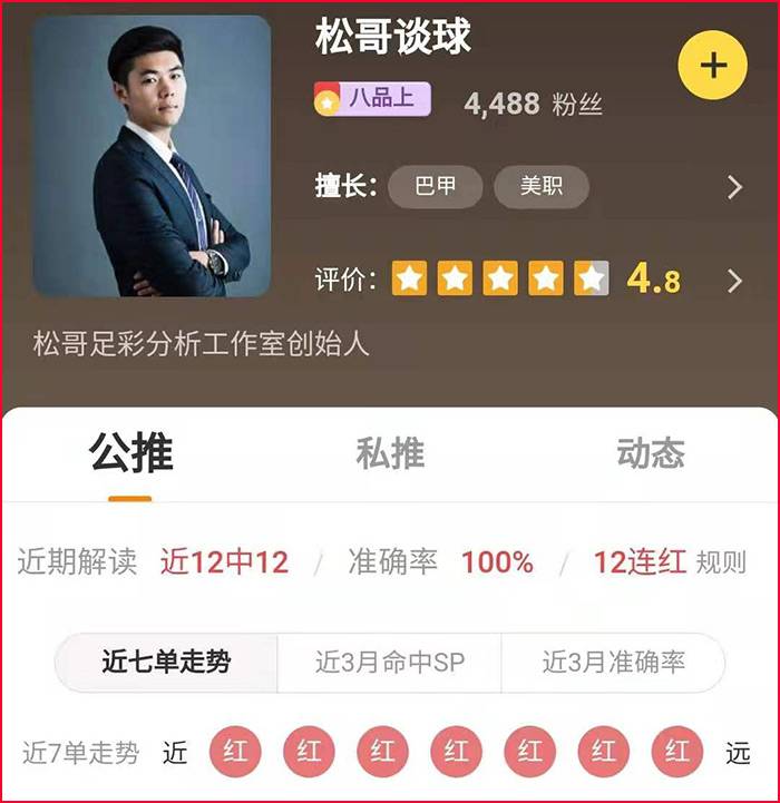 分析师【松哥谈球】12连红,回报率738%!欧洲杯结束之后,松哥在美洲赛事上屡建奇功。巴西乙、美职、南俱杯、解放者杯,松哥已经连中7场。加上期间推荐的北欧赛事、日系赛事和欧冠资格赛,一举拿下12连红的超燃战绩。【定制松哥谈球冲击13连红】