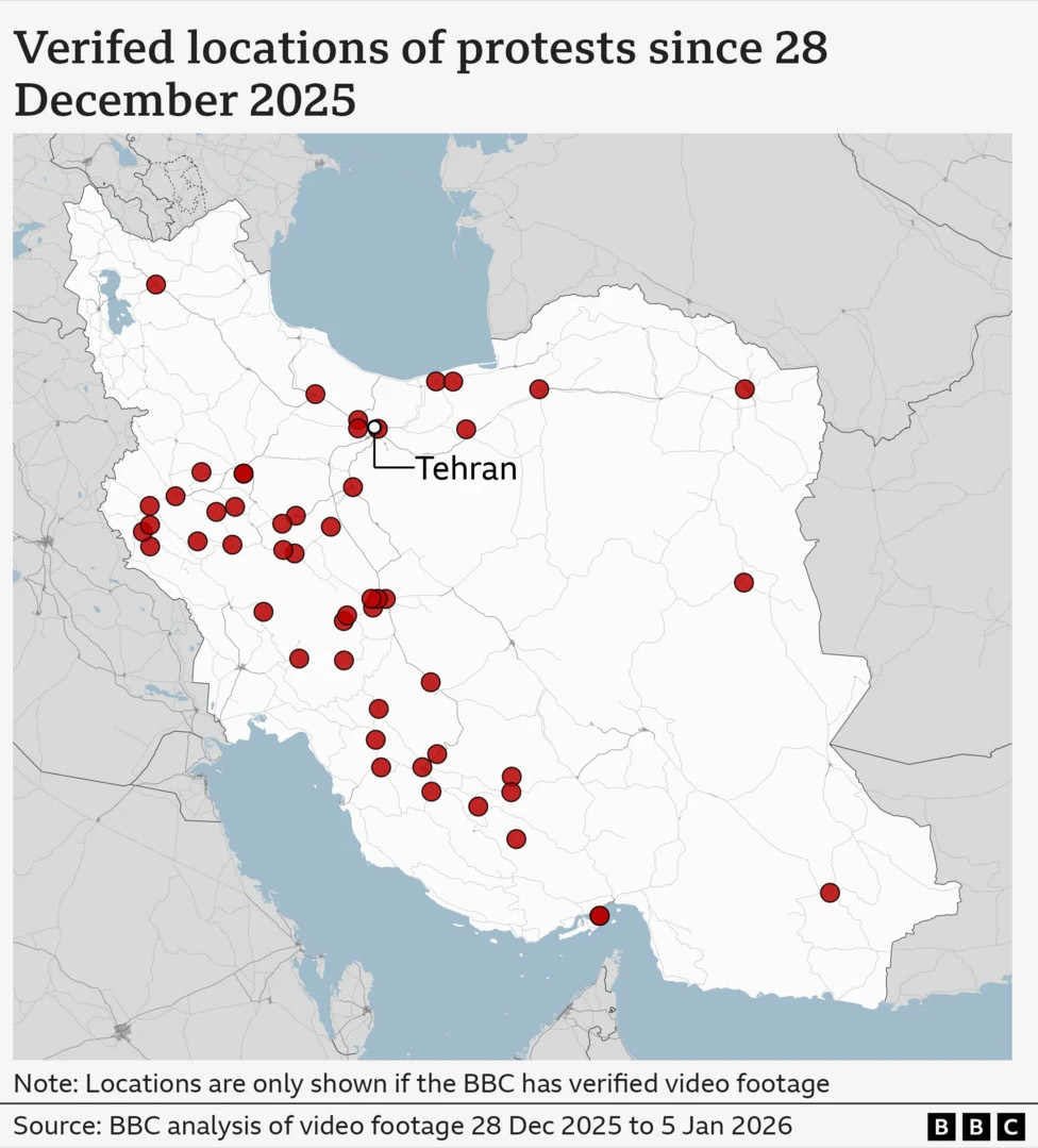 网络上流传的视频显示,伊朗全国50多个城镇出现和集会,其中包括拉扎维霍拉桑省首府马什哈德市、库姆省首府库姆市等主要城市。BBC称,在分析了网络上100多个视频的拍摄地点和拍摄时间后发现,伊朗31个省份中的至少17个爆发了。
